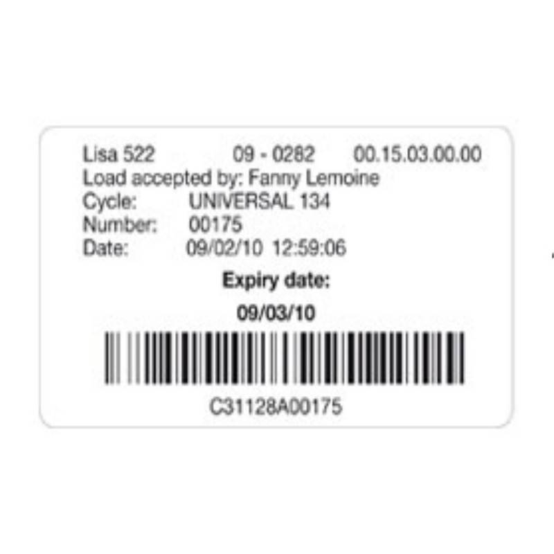 Las etiquetas del código de barras LisaSafe contienen toda la información necesaria para relacionar los productos esterilizados con el ciclo de esterilización y el historial del paciente, es decir, incluye:
