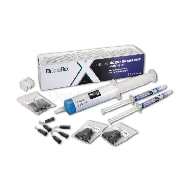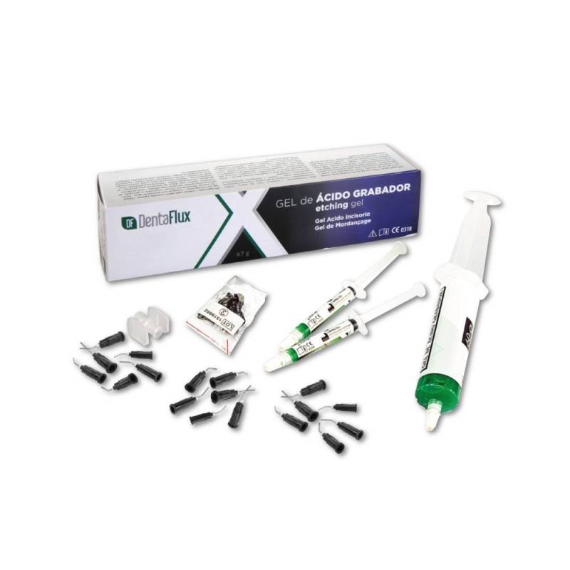 El gel grabador ácido fósforico 37% de Dentaflux se presenta en jeringa de 50 ml + accesorios.