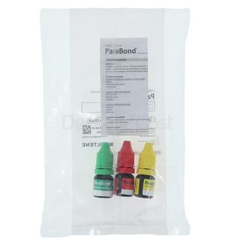 El sistema Parabond de Coltène consta de: 1 bote Non-Rinse Conditioner de 3 ml + 1 bote adhesivo A de 3ml + 1 bote adhesivo B de 3ml.