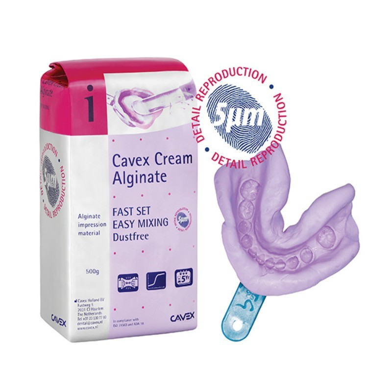 Cavex Cream Alginate de Cavex es un novedoso alginato con una inigualable precisión de reproducción de detalles de 5 micras, que forma una excelente combinación junto a su alta resistencia al desgarro y su fraguado rápido.