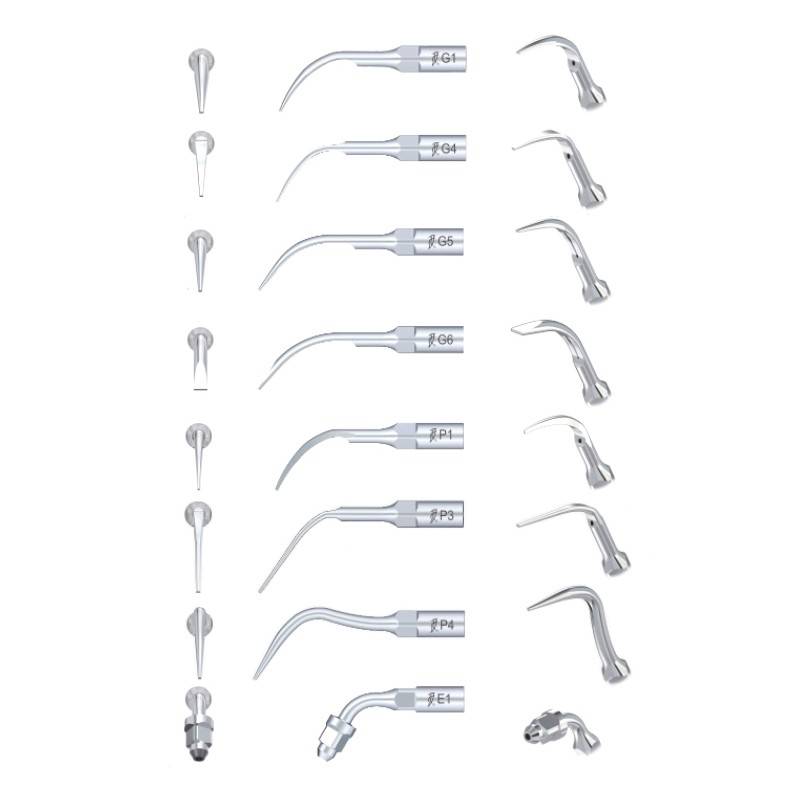 El aparato de ultrasonidos UDS-E incluye, además de la pieza de mano, 8 puntas tipo EMS (limpieza G1, G4, G5, G6; periodoncia P1, P3, P5 y endodoncia E1).