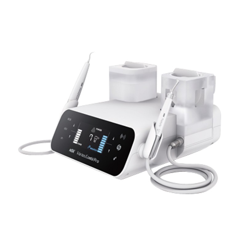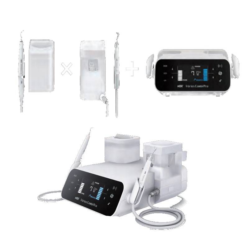 Varios Combi Pro de NSK es un dispositivo de profilaxis que combina 2 sistemas en 1. Combina la limpieza por ultrasonidos con el pulido por aire para ofrecer una higiene oral más eficaz y confortable mientras mantiene la placa bacteriana bajo control.