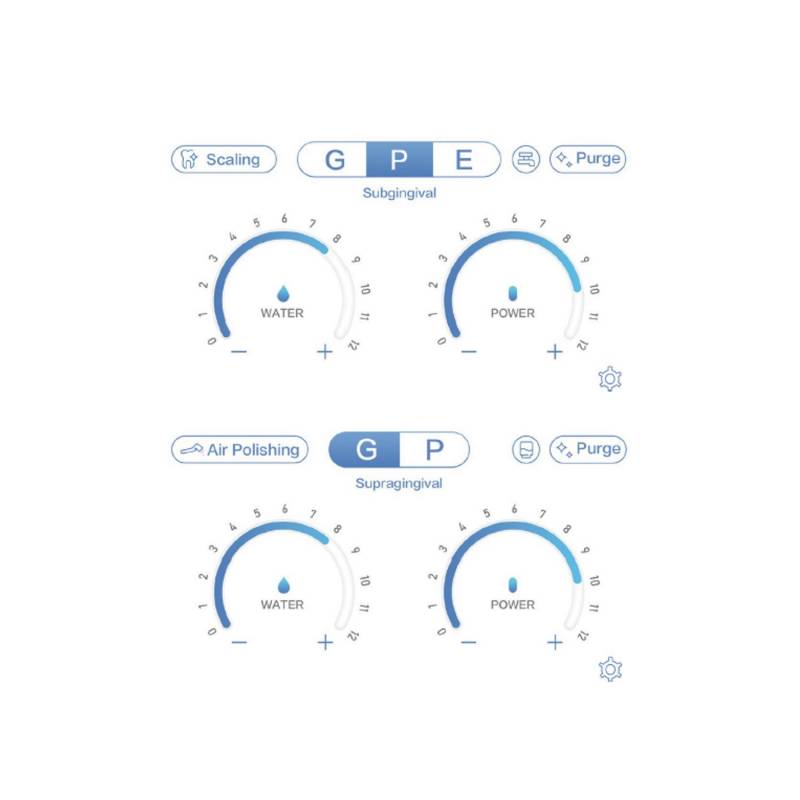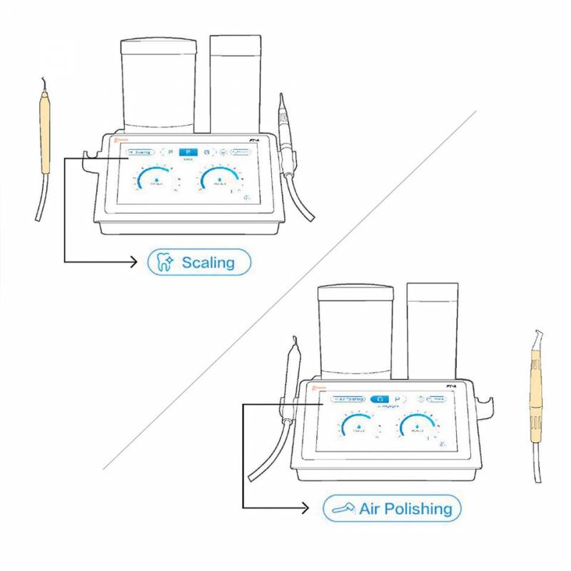 Cuenta con función de reconocimiento automático del modo de uso: al levantar la pieza de mano ultrasónica, el equipo entra en modo de escalado por ultrasonidos y si se levanta la pieza de mano del aeropulidor, se activa automáticamente el modo para escalado por aeropulido.