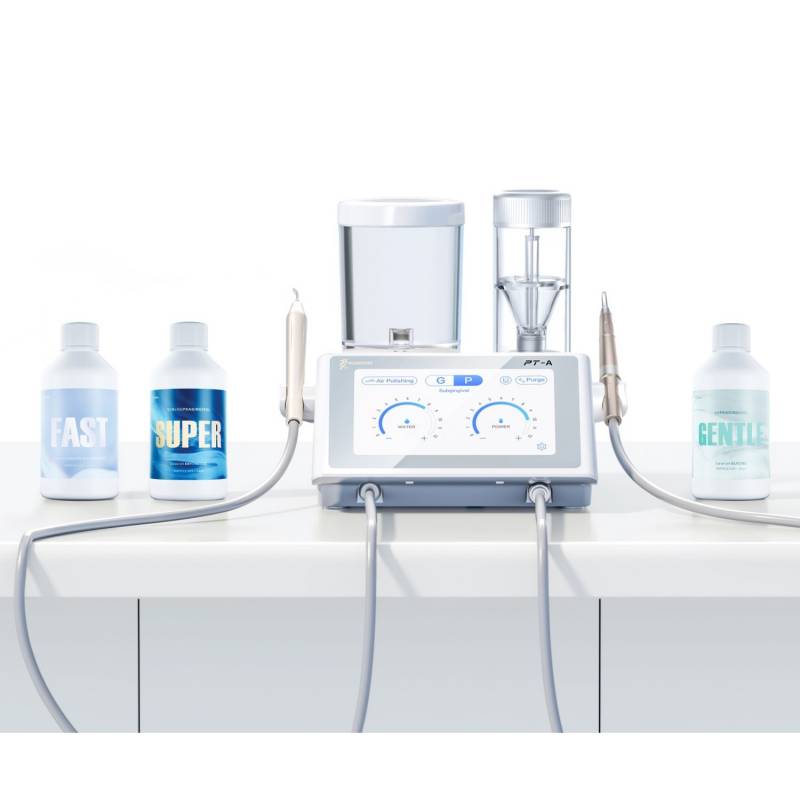 La función principal del aeropulidor PT-A Woodpecker es pulir la superficie de los dientes ya que después de una limpieza con un scaler de ultrasonido los pacientes pueden notar la superficie dental algo más áspera y desigual. Tras el uso de PT-A la superficie es suave y menos propensa a que la placa y el pigmento se adhieran a él.