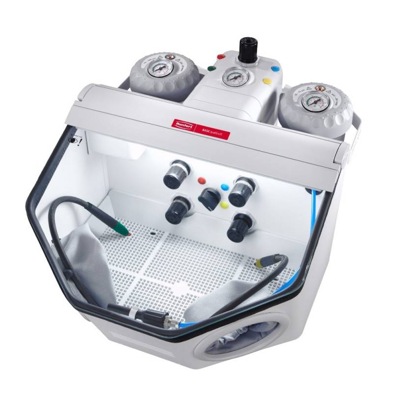 La arenadora Renfert Basic Quattro IS de gran volumen (20 litros) ofrece una gran libertad de movimientos en la cabina de arenado.