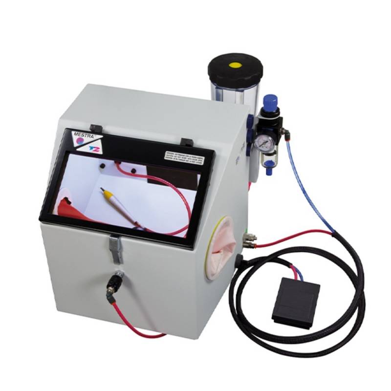 La microarenadora Terra II de Mestra ofrece una óptima visibilidad a través del cristal de su ventana para facilitar la realización de cualquier labor de arenado.