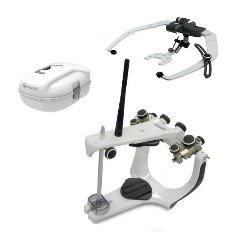 Kit ahorro de sistema de articulación maxilo-facial, compuesto por articulador A7 Plus E, arco facial Elite y estuche de transporte de Bio-Art.