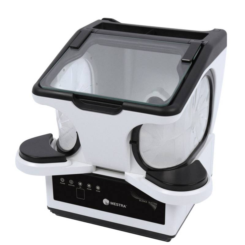 La caja de repaso con aspiración de sobremesa Sirocco S de Mestra es un conjunto equilibrado y compacto perfecto para laboratorio dental.