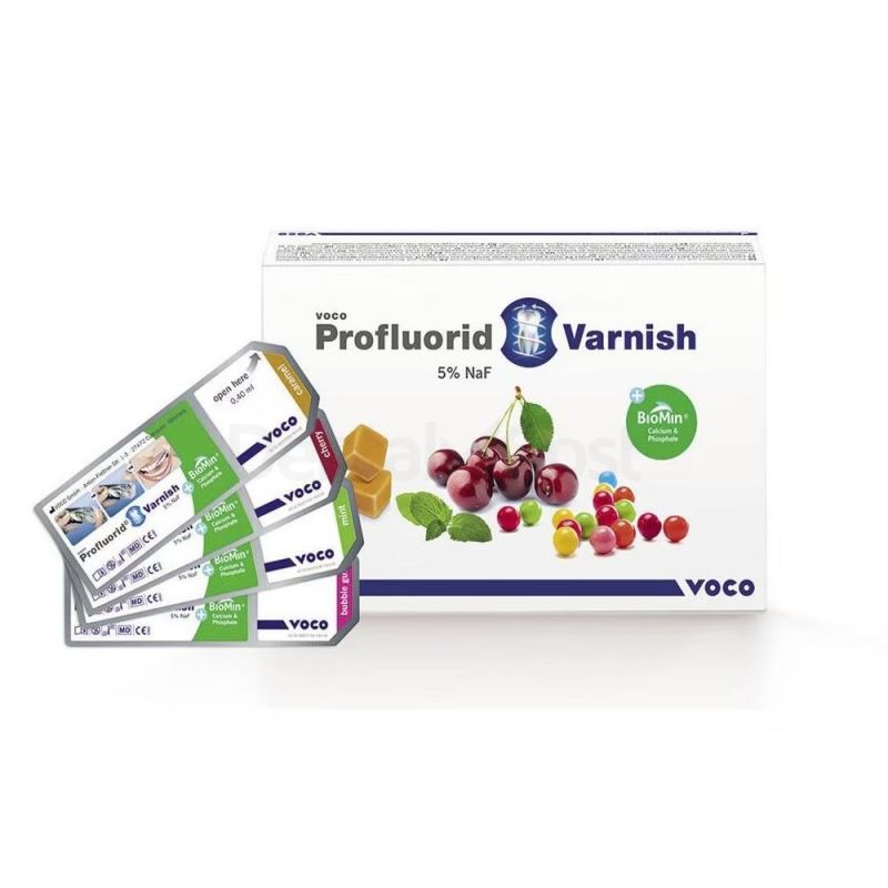 El barniz desensibilizante Profluorid Varnish + Biomin de Voco contiene fluoruros a un 5% de NaF (≙ 22.600 ppm de fluoruro) y Biomin. La adición de Biomin libera iones de calcio y fosfato. Estos iones son componentes para mantener la salud dental.