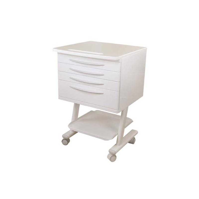 - Carrito con 4 cajones, encimera laminada con asa y estante inferior.
