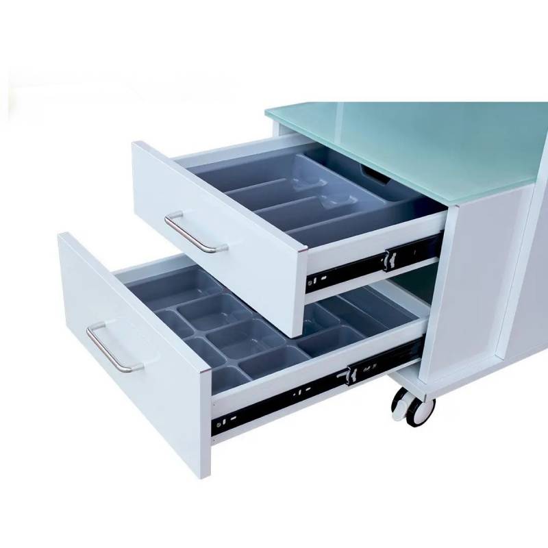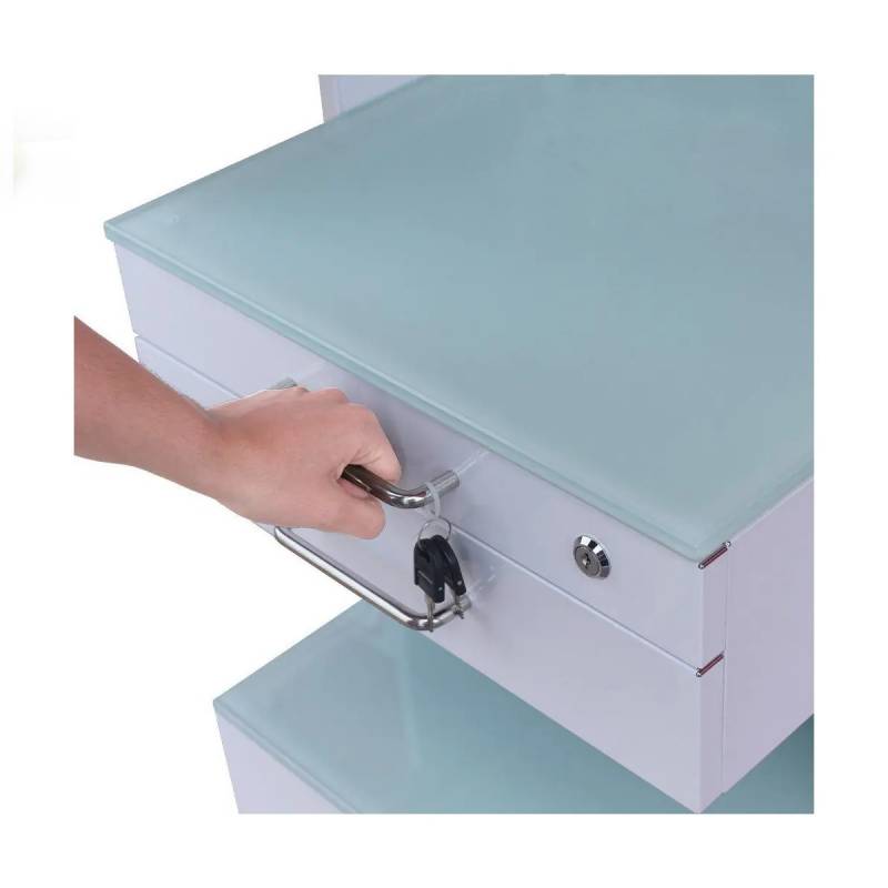 Con materiales de alta calidad, la cajonera móvil está fabricada con aluminio recubierto de pintura Epoxi salvo las dos partes de la encimera, que son de cristal antideslizante.