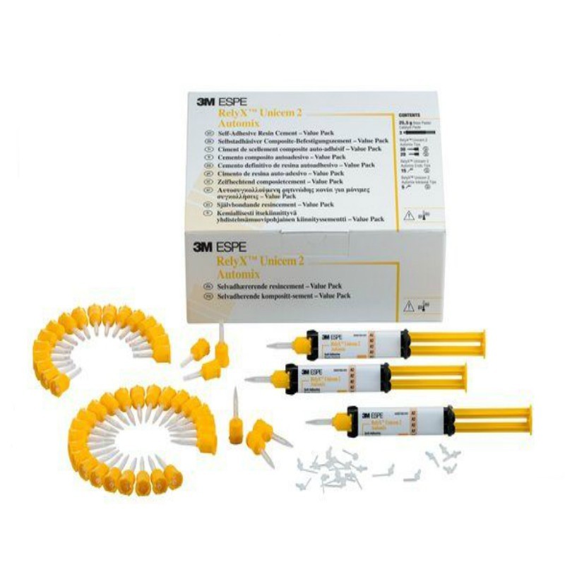 El envase de Relyx Unicem 2 Automix Promo Pack Tono A2 Universal de 3M contiene: 3 jeringas de 8,5 g + 30 puntas de mezcla normales + 20 puntas de mezcla anchas + 15 puntas endo + 5 puntas intraorales.