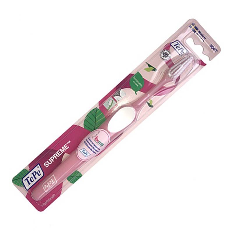 Cepillo TePe Supreme PINK RIBBON es un cepillo de dientes para una correcta limpieza bucal, apto para pacientes con implantes, con ortodoncia, y también pacientes con periodontitis o gingivitis.