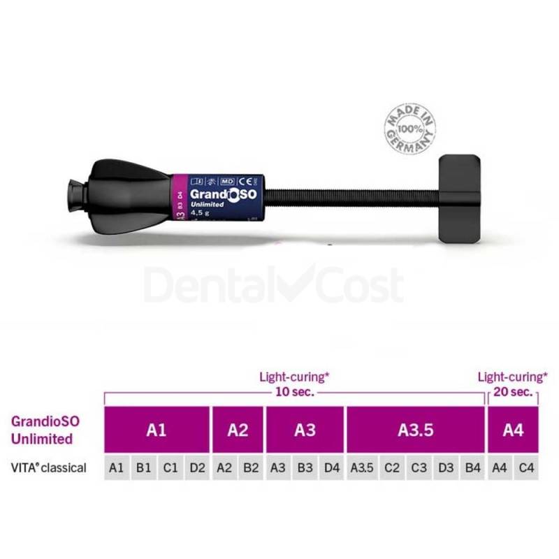 GrandioSO Unlimited de VOCO es un composite universal nano-híbrido radiopaco y fotopolimerizable que no precisa de estratificación gracias a la Tecnología de Transformación Visual (VTT) pudiéndose aplicar en capas de 4 mm cada vez.