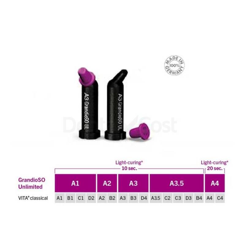 El Trial pack de GrandioSO Unlimited de VOCO contiene 10 cápsulas de 0,3g (2 de cada tono A1 - A2 - A3 - A3.5 - A4) + 10 monodosis de Futurabond U.