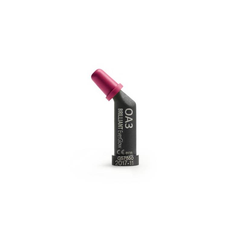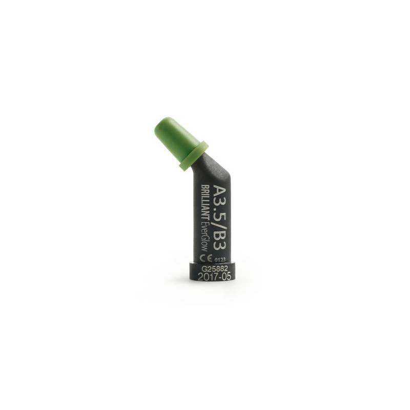 Brilliant Everglow de Coltène es un composite híbrido submicrónico universal de alto relleno; con un intervalo de partículas de relleno inorgánicas de 0,02-1,5µm., con un contenido de relleno inorgánico por volumen de 56% y por peso de 74%.