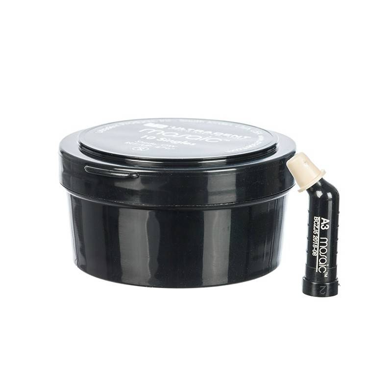 Mosaic de Ultradent es un composite Universal fotopolimerizable, de base Bis-GMA. Nanohíbrido con vidrio cerámico de circonia-sílice y sílice de 20 nanómetros; con carga del relleno de 68% por volumen para los tonos dentina y 56% para los tonos esmalte. Gracias a esta fórmula consigue restauraciones de gran calidad estética. Además, su perfecta combinación entre rendimiento y alta estética, garantiza unas restauraciones duraderas.