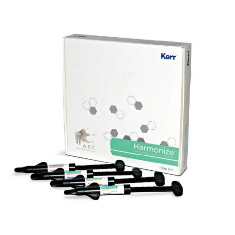 El Kit Intro de Harmonize de Kerr Dental contiene: 4 jeringas de 4g. (1 de dentina A3, 1 de dentina A3.5, 1 de esmalte A2, 1 de esmalte A3) + instrucciones de uso.