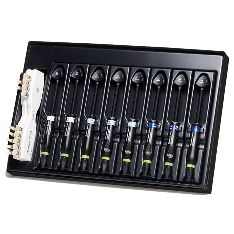 El envase de IPS Empress Direct Basic Kit de Vivadent contiene 8 jeringas de 3gr en diferentes tonalidades.