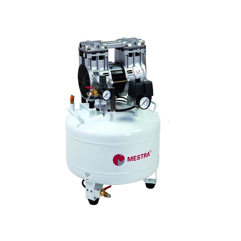 Compresor a pistón seco de Mestra con calderín de 30 litros de capacidad, destaca por su excelente fiabilidad, funcionamiento ultrasilencioso, durabilidad y facilidad de matenimiento.
