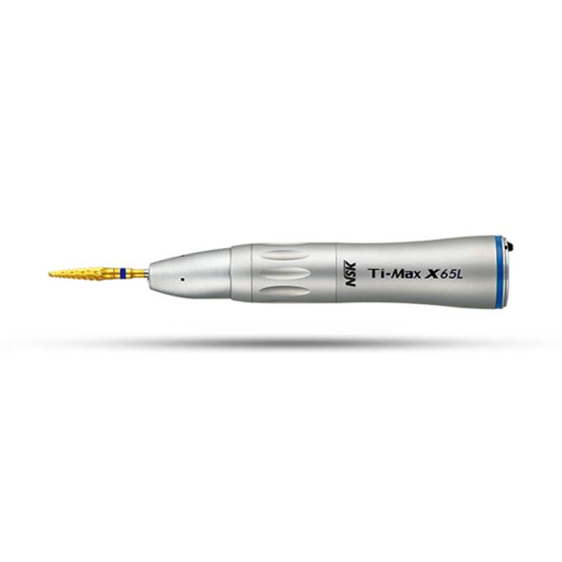 El instrumento rotatorio X65L Ti-Max serie X de NSK es una pieza de mano recta que cuenta con luz, óptica de vidrio celular.