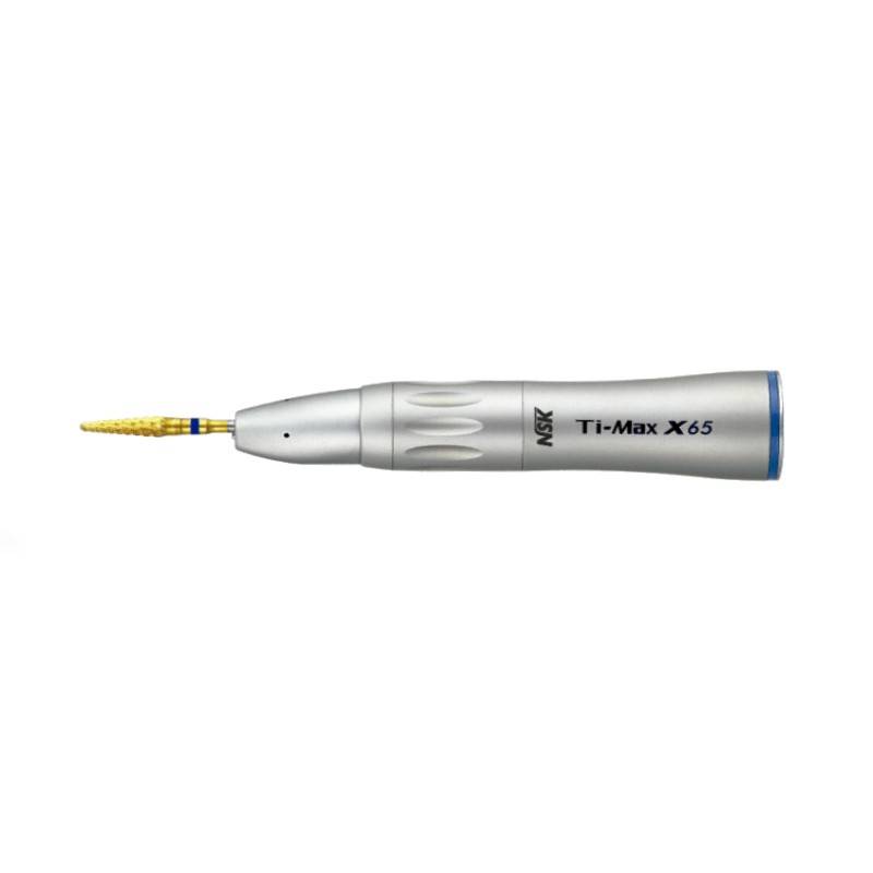 El modelo X65 Ti-Max serie X de NSK es una pieza de mano recta que cuenta con una transmisión de velocidad directa 1:1 para fresas HP Ø2,35 y CA de Ø2,35mm.