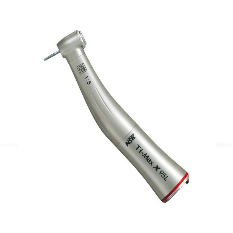 El instrumento rotatorio X95L Ti-Max serie X de NSK es un contraángulo multiplicador 1:5 con rodamientos cerámicos y luz óptica de vidrio celular.