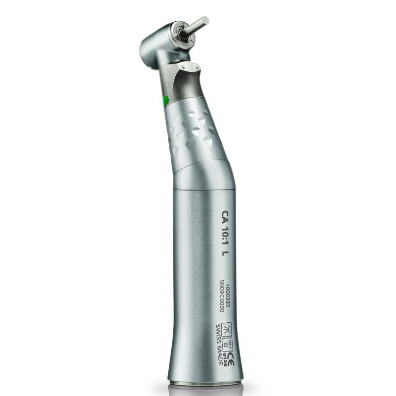 El contraángulo Bien Air CA 10:1 L cuenta con luz LED con tecnología de vidrio óptico multifilamento, que garantiza una visibilidad intraoral sin obstaculos desde ángulos más amplios.