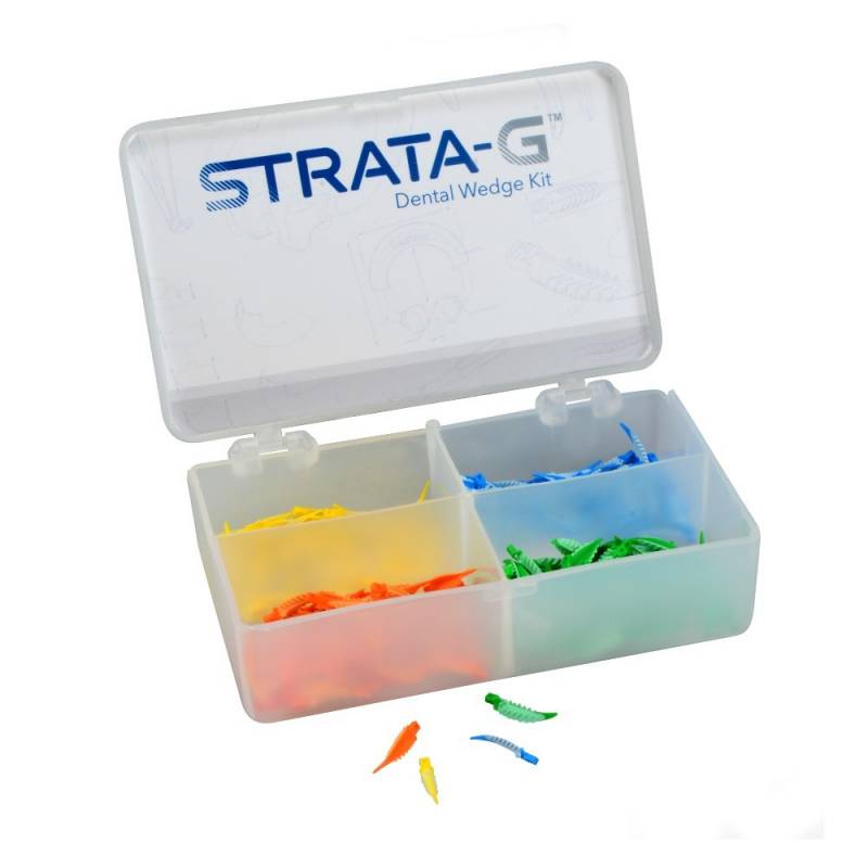 El kit surtido de Cuñas interproximales Strata-G de Garrison contiene 200 unidades (50 unidades de cada tamaño).
