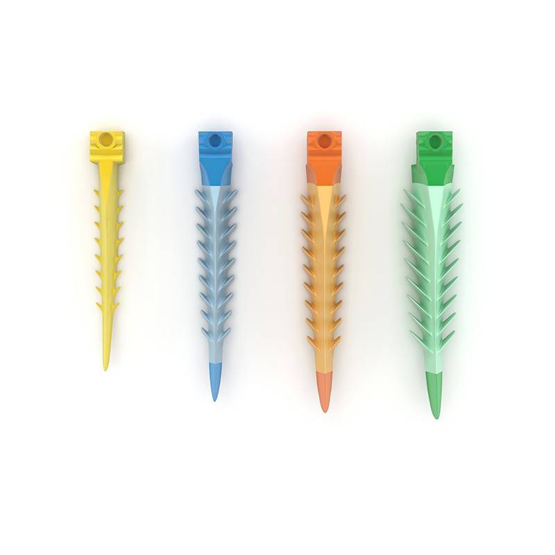 - Aletas retentivas blandas que facilitan la inserción y extracción.