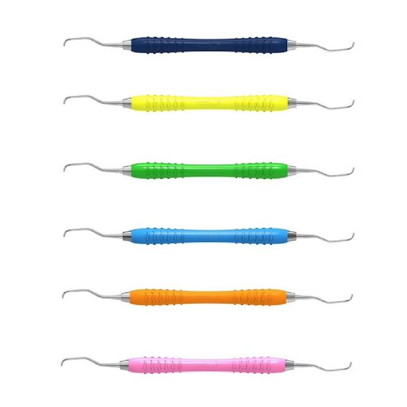 Con mango de silicona, Colori Silikon, termoestable y antideslizante de núcleo de acero inoxidable muy ligero y sellado antibacteriano. Mangos codificados por color para una identificación sencilla del instrumental.