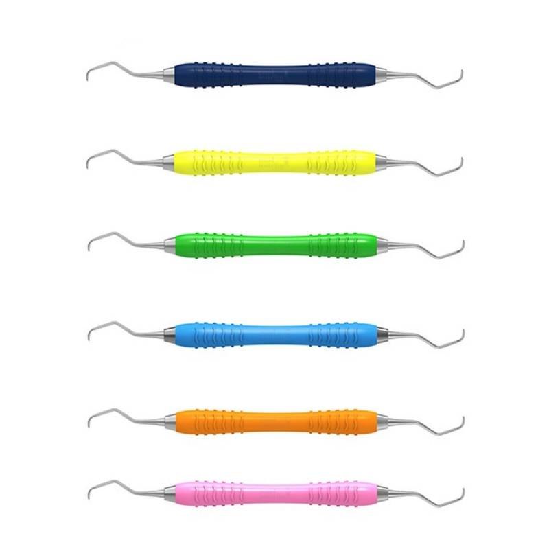 Con mango de silicona, Colori Silikon, termoestable y antideslizante de núcleo de acero inoxidable muy ligero y sellado antibacteriano. Mangos codificados por color para una identificación sencilla del instrumental.