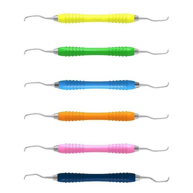 Con mango de silicona, Colori Silikon, termoestable y antideslizante de núcleo de acero inoxidable muy ligero y sellado antibacteriano. Mangos codificados por color para una identificación sencilla del instrumental.