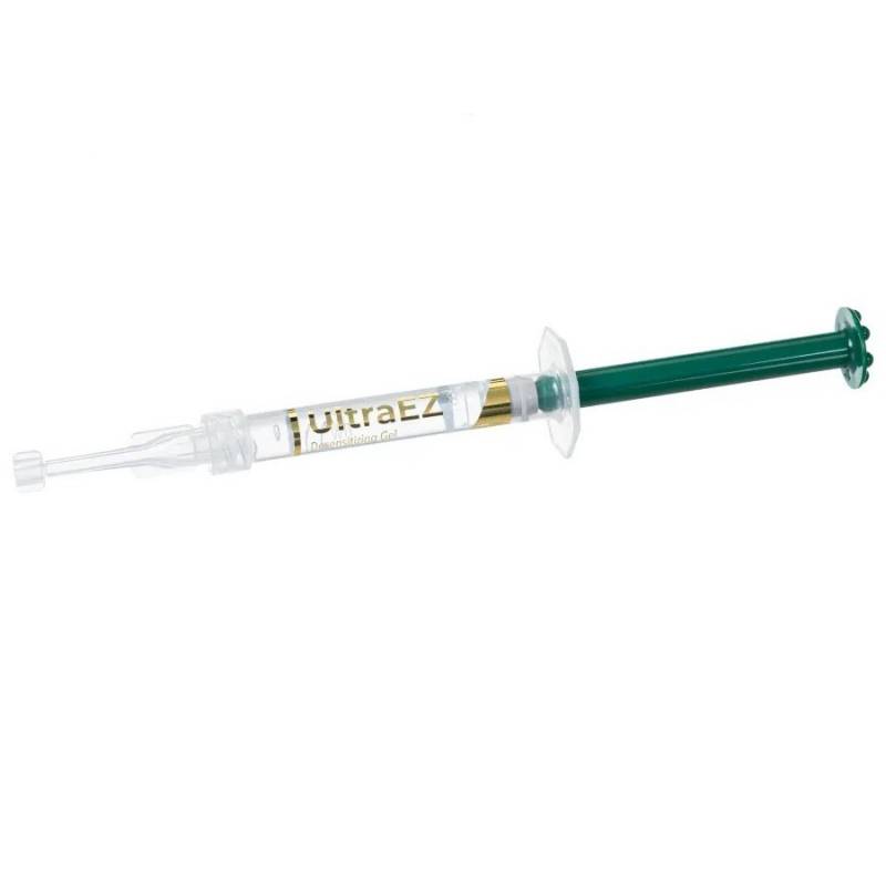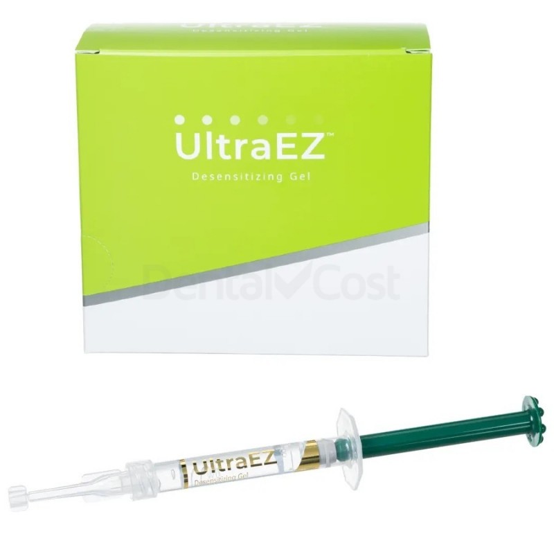 UltraEZ de Ultradent es un gel desensibilizante único, adhesivo, viscoso, de liberación sostenida, con nitrato de potasio al 3 % y con ion fluoruro al 0.11 % en peso por peso.