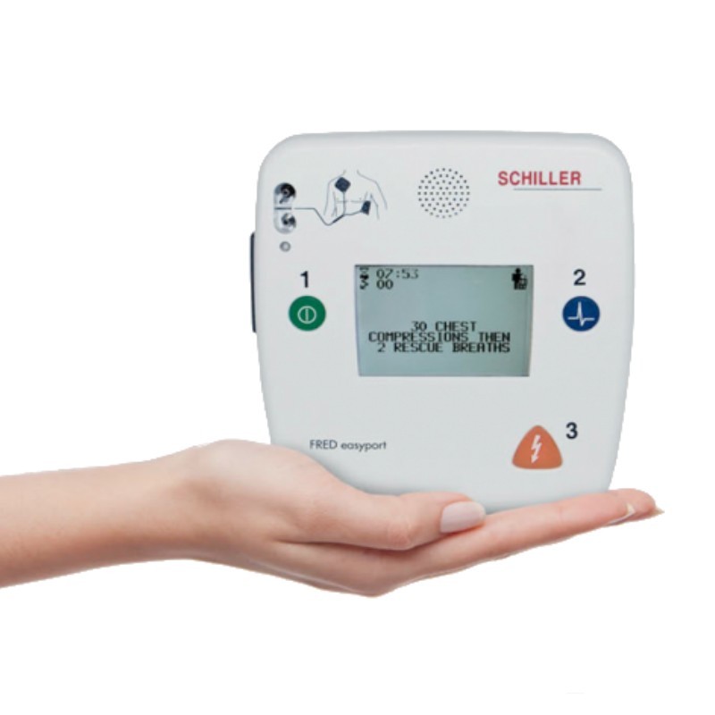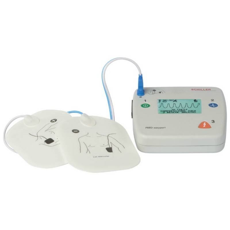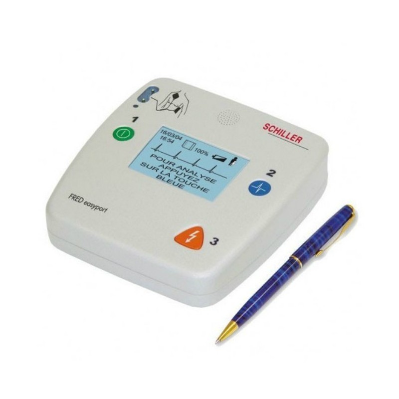 Fred Easyport 150J de Schiller es un desfibrilador extraordinariamente pequeño y ligero, de tamaño bolsillo, que cumple todos los requisitos de un moderno DEA (Desfibrilador automático externo).
