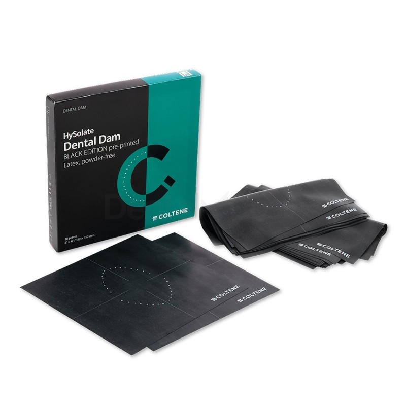 El dique de goma HySolate Latex Dental Damm Black Edition extra grueso de Coltène, Hygenic está fabricado en puro látex 100% natural, sin polvo.