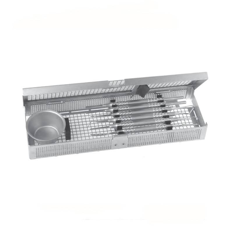Todo presentado en una caja de esterilización (bandeja, tapa) 9100-50 GPM. Fabricada en acero inoxidable con tiras de silicona para una firme sujeción de los instrumentos durante el lavado o almacenamiento. Sus grandes perforaciones garantizan una limpieza eficaz. Medidas: 275,0 x 87,0 x 35,0 mm.