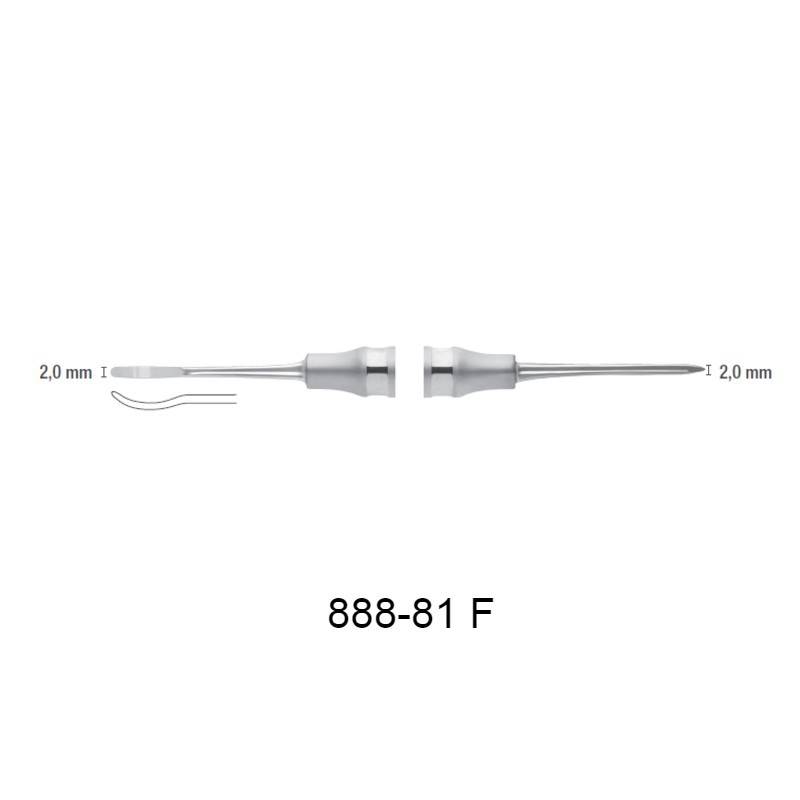 - 888-81 F - Micro Elevador Interdental-Perióstico Palti - 17,1 cm - 2,0 mm. - El elevador perióstico fue diseñado específicamente para su uso en cirugía periodontal. Es crucial para un procedimiento exitoso, especialmente en relación con las medidas regenerativas, que se logre un cierre hermético de la herida después de la cirugía. Un requisito previo para ello es la máxima conservación posible de los tejidos blandos. Este problema se presenta en el área interdental y gracias este elevador perióstico muy estrecho y afilado la tarea se simplifica.