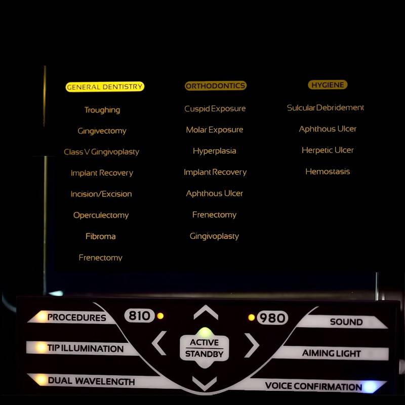 Este láser está indicado en todos los tratamientos de tejidos blandos: remover, extirpar y coagular tejidos, principalmente en procedimientos quirúrgicos dentales.