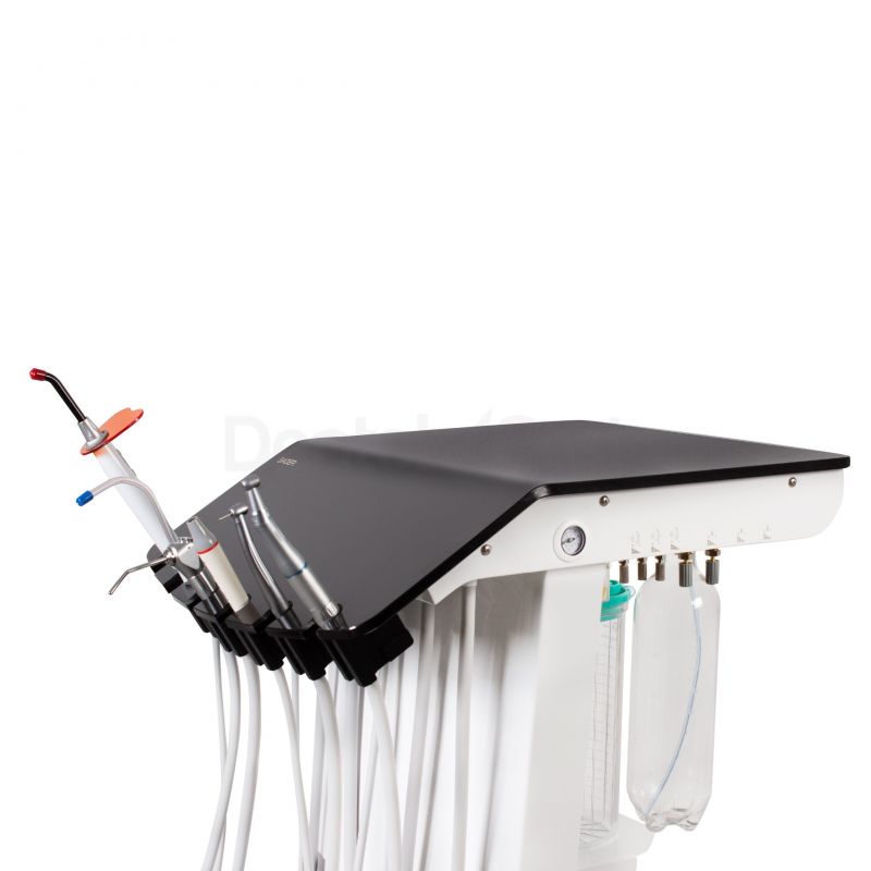 El Cart con compresor viene equipado con aspiración, jeringa triple, lámpara de fotocurado y ultrasonido, proporcionando las herramientas clave para tratamientos clínicos.