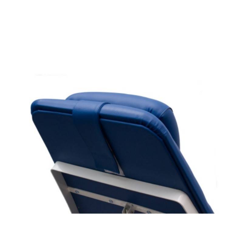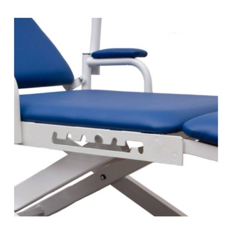 Con tapicería azul, el respaldo de la camilla dental es, totalmente, ajustable de 90 a 160 grados. Para mayor confort del paciente, la silla ofrece seis posiciones regulables en altura. Además, de un cómodo reposapies, también incluye los apoyabrazos.
