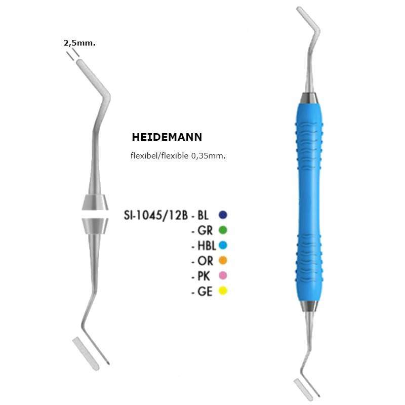 El instrumento dental SI-1045/12B es una espátula doble Heidemann de partes activas planas y de tamaño 2.5mm, flexibel 0,35mm.