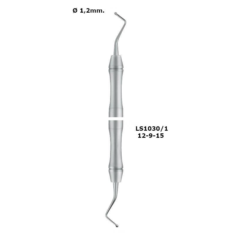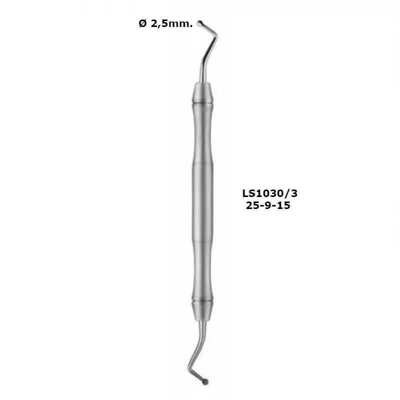 Posee doble parte activa, en angulación bi, terminada en forma de bola partida o cucharilla.