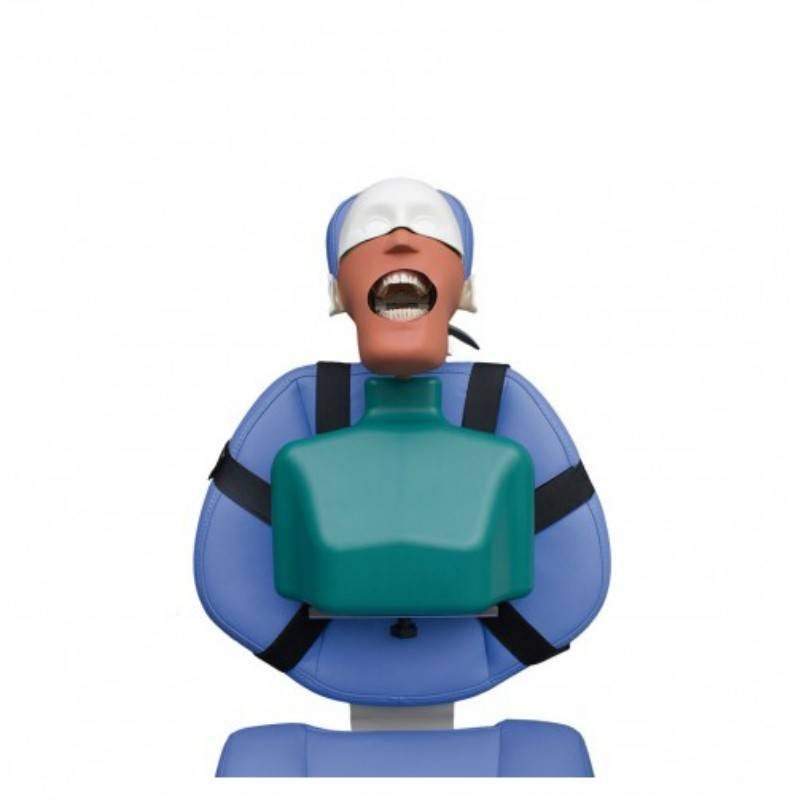 Con cinturones para sujetar el torso al sillón dental. Además, el torso puede ser fijado a la mayoría de ellos.