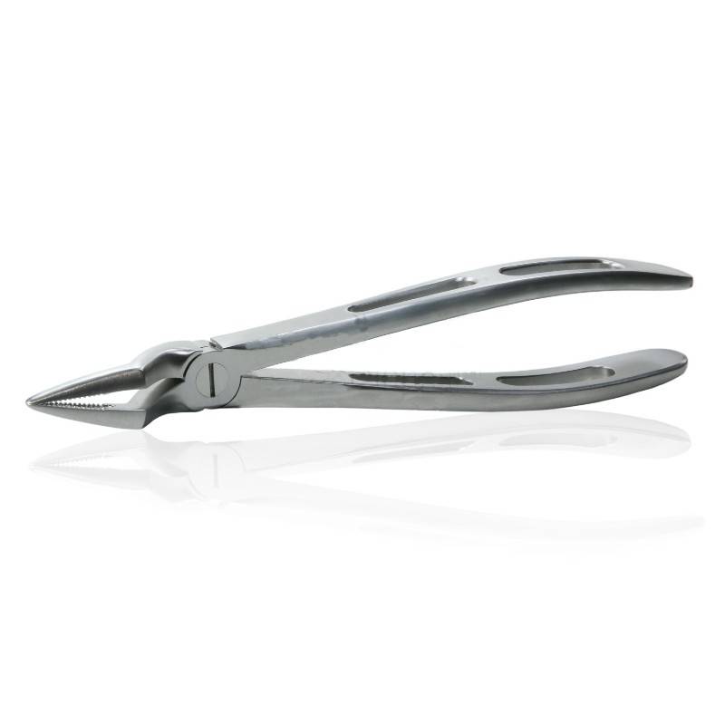 La parte activa del fórceps es fina, delgada, delicada y aplanada lateralmente con un dentado potente que permite un profundo agarre del diente hasta el alveolo, así como un óptimo movimiento de rotación proximal.