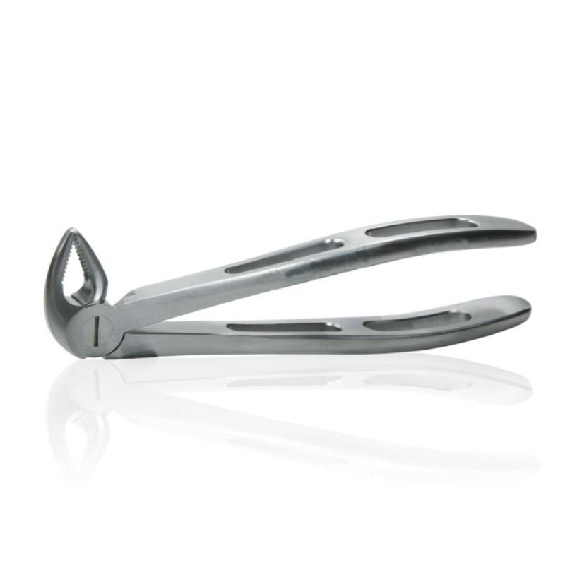 La cabeza del fórceps es fina, delicada y aplanada lateralmente con un dentado potente que permite un profundo agarredel diente hasta el alveolo, así como un óptimo movimiento de rotación proximal.