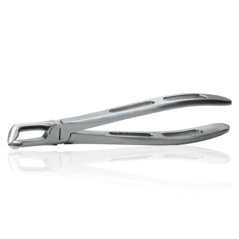 La cabeza del fórceps es delgada, fina y aplanada lateralmente con un dentado potente que posibilita un profundo agarre del diente hasta el alveolo, así como un óptimo movimiento de rotación proximal.