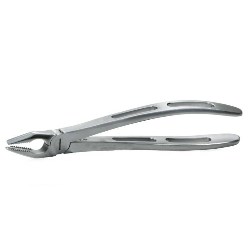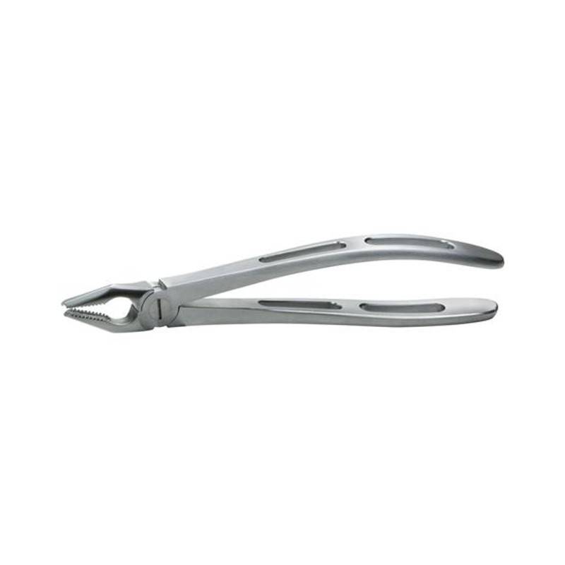 La cabeza del fórceps es fina, delgada y aplanada lateralmente con un dentado potente que permite un agarre profundo del diente hasta el alveolo, así como un óptimo movimiento de rotación proximal.