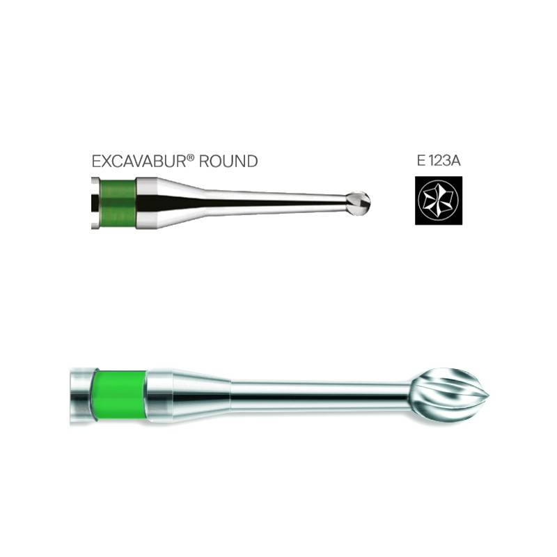 La fresa Excavabur de Maillefer con su diseño especial, caña de acero inoxidable con cuello y cabeza redonda en carburo de tungsteno; material que aporta dureza y un gran poder de corte.