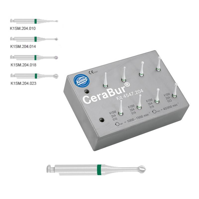 El set intro con fresero Cerabur 4547.204.K1SM Minimal Invasive de Komet contiene 8 unidades (2 de cada fresa) de los siguientes tamaños: